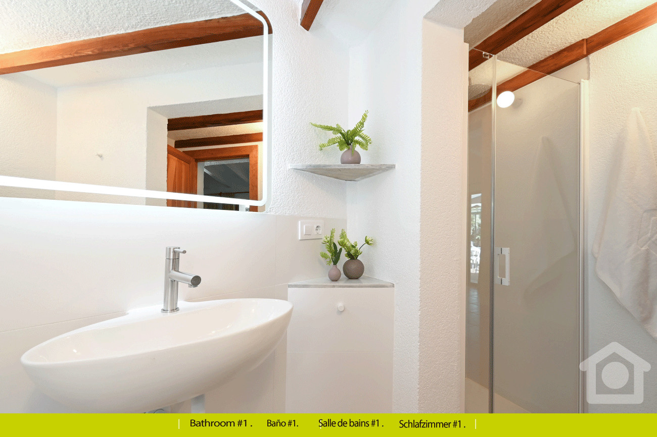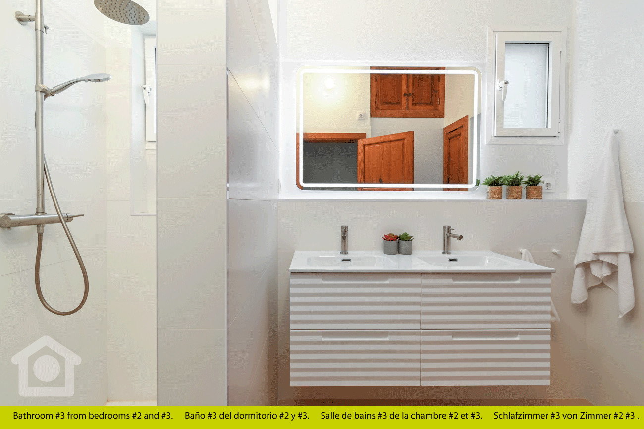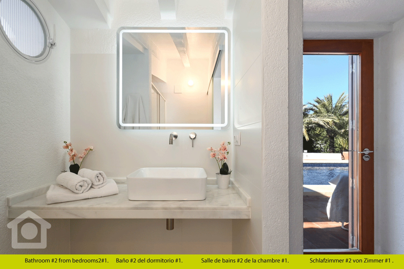 Sus seis dormitorios disponen de aire acondicionado y hermosas vistas al mar. En la planta superior se encuentra el dormitorio principal que dispone de un baño con ducha en suite además de una terraza acristalada. En la misma planta hay otros 2 dormitorios dobles que comparten un baño con bañera, uno con cama de matrimonio y otro con dos camas de 90. En la planta baja se encuentra otro dormitorio con cama de matrimonio y una terraza acristalada con espectaculares vistas panorámicas. Junto a él se encuentra un baño con ducha. Los otros dos dormitorios se encuentran junto a la piscina con acceso independiente de la casa principal. Estos dos dormitorios son ideales para una familia con niños ya que están comunicados por una puerta y comparten un baño con ducha.