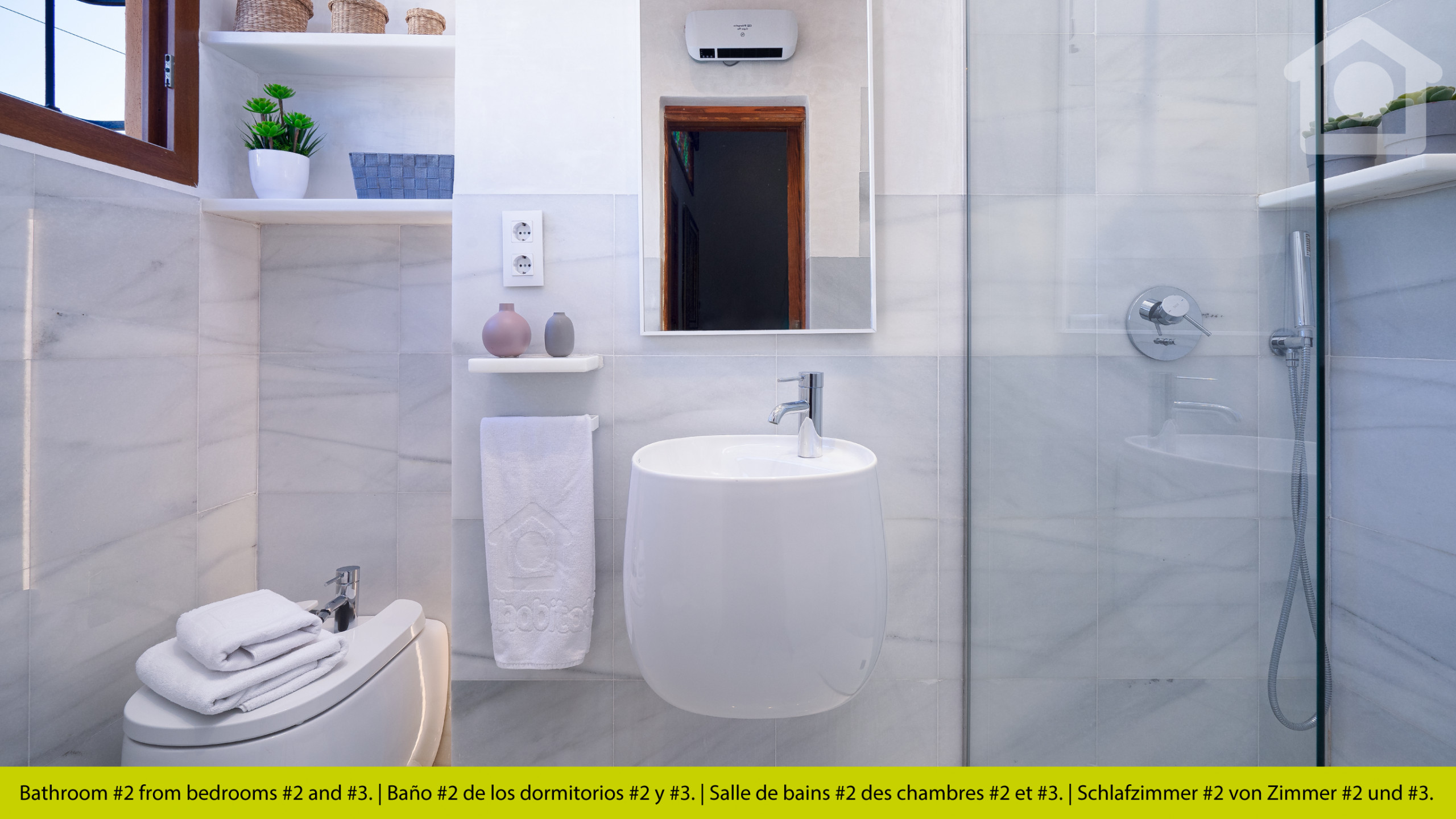 All its six bedrooms have air conditioning and breathtaking sea views. On the top floor, is the master bedroom which has an ensuite bathroom with shower, and a glazed terrace. On the same floor, there are another 2 bedrooms that share a bathroom with a bathtub, one bedroom with a double bed and the other with two single beds. On the ground floor, there is another bedroom with a double bed and a glazed in terrace with spectacular panoramic views. Next to it is a bathroom with shower. The other two bedrooms are located next to the pool with independent access from the main house. These two bedrooms are ideal for a family with children as they are connected by a door and share a bathroom with shower.