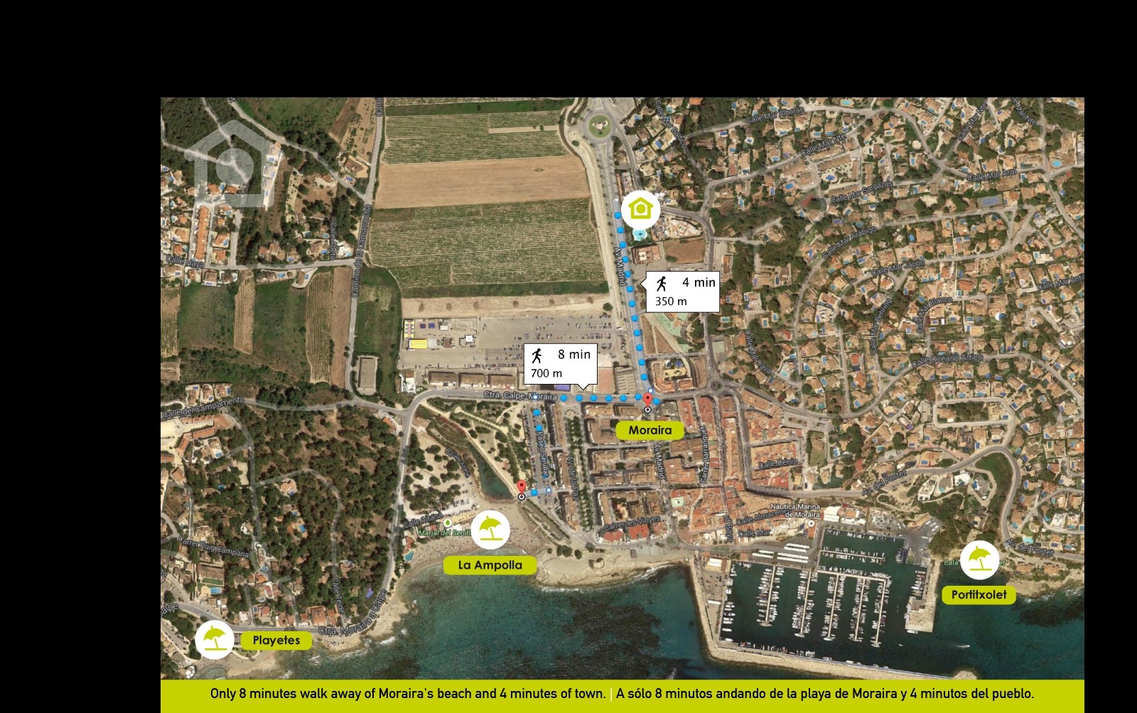 N’hésitez pas et venez profiter de vos vacances à Moraira. Dans ce joli village de pêcheurs et ses environs, vous profiterez d’un environnement privilégié avec de bons restaurants, des terrains de golf, des activités sportives et aquatiques, des randonnées, des visites culturelles, d’excellents services de santé, de la sécurité et de la tranquillité. Les aéroports internationaux d'Alicante et de Valence se trouvent à seulement 1 heure de Moraira. En moins d’une heure de voiture, vous pourrez visiter d’autres destinations touristiques connues telles que Benidorm, Denia, Alfaz del Pi, Castell de Guadalest, etc. Vous pouvez également visiter les célèbres îles Baléares, Ibiza et Formentera, en seulement 2 à 3 heures de ferry.