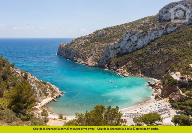 Cette merveilleuse maison est entourée d'un jardin méditerranéen exquisément entretenu où se distinguent les rosiers, les bougainvilliers et les oliviers. Elle est située sur un grand terrain rustique entouré d'arbres et de vignobles. Un emplacement privilégié, très privé, presque sans voisins et à seulement 600 mètres du charmant village de pêcheurs de Moraira, célèbre pour ses plages de sable spectaculaires aux eaux cristallines, sa tranquillité, et la qualité de ses offres de restauration et de commerce.
